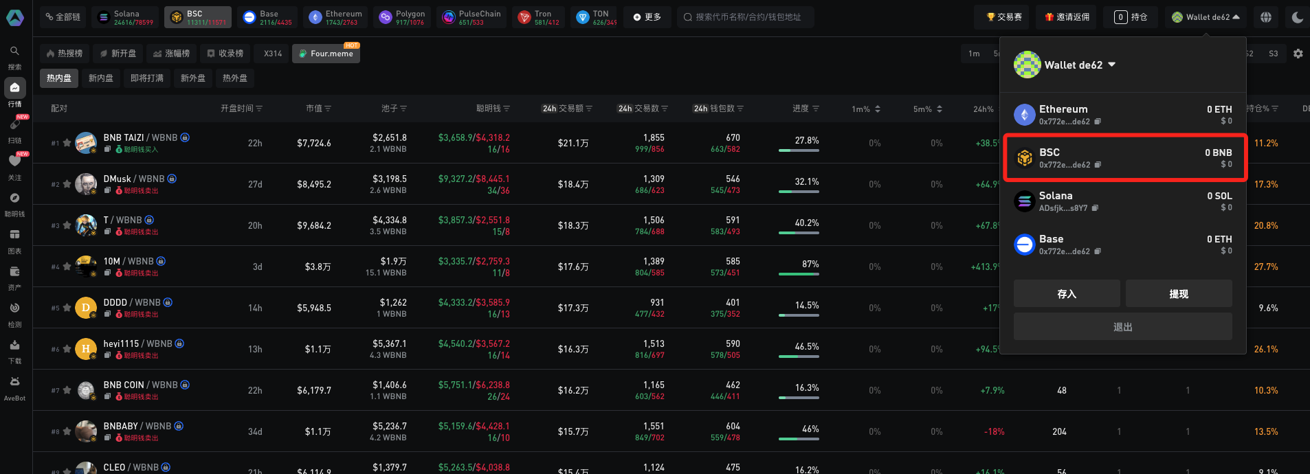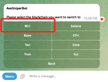 Ave.ai Bot钱包与Telegram Bot一键登录均自动支持BNB Chain。同时，Ave.ai支持Bianace钱包，OKX钱包等第三方链钱包。