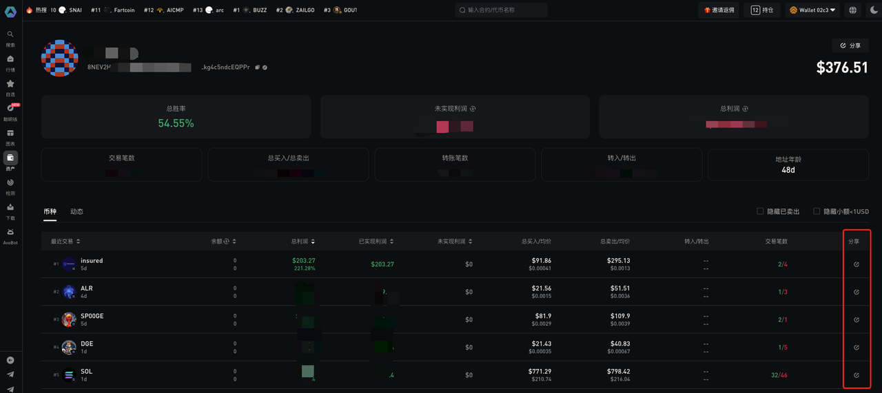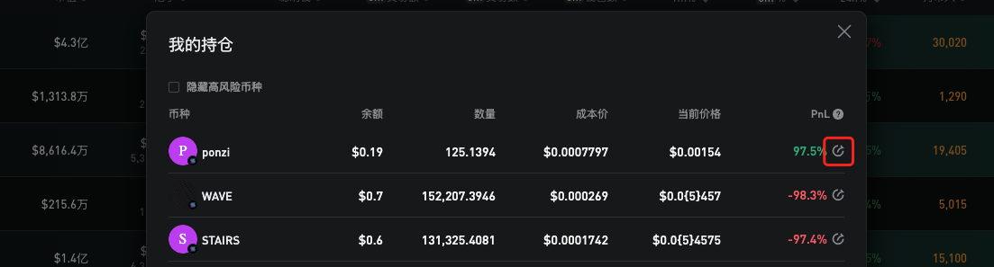 打开你持有的代币页面，然后单击 我的持仓 以分享交易。