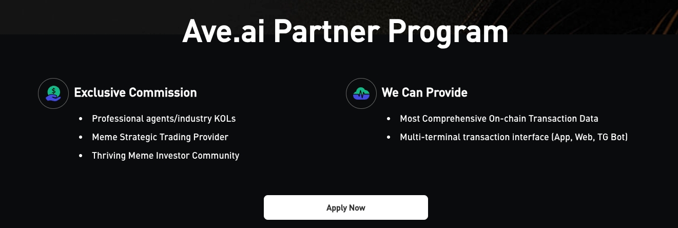 Đối với các sàn giao dịch, đội ngũ dự án, DEX, cộng đồng, phương tiện truyền thông, ứng dụng xã hội và công cụ tiện ích (ví dụ: bot) tham gia chương trình, AVE.AI tận dụng cơ sở người dùng của mình và đối tác để thúc đẩy tiếp thị chung và hỗ trợ lưu lượng truy cập.