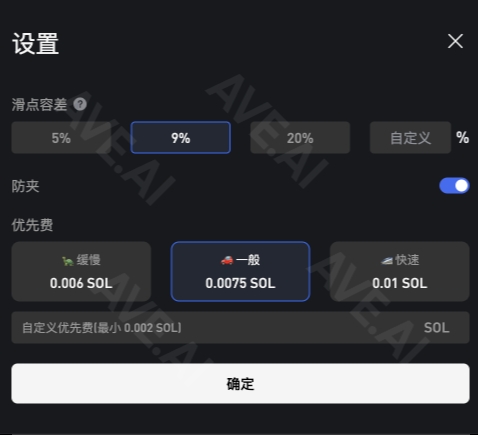 Trượt giá (Slippage) xác định mức độ chênh lệch tối đa chấp nhận được trong một giao dịch. Trượt giá cao giúp tăng tốc độ giao dịch. Thông thường, nên đặt trượt giá ở 9%, hoặc lên đến 20% khi thị trường biến động mạnh.