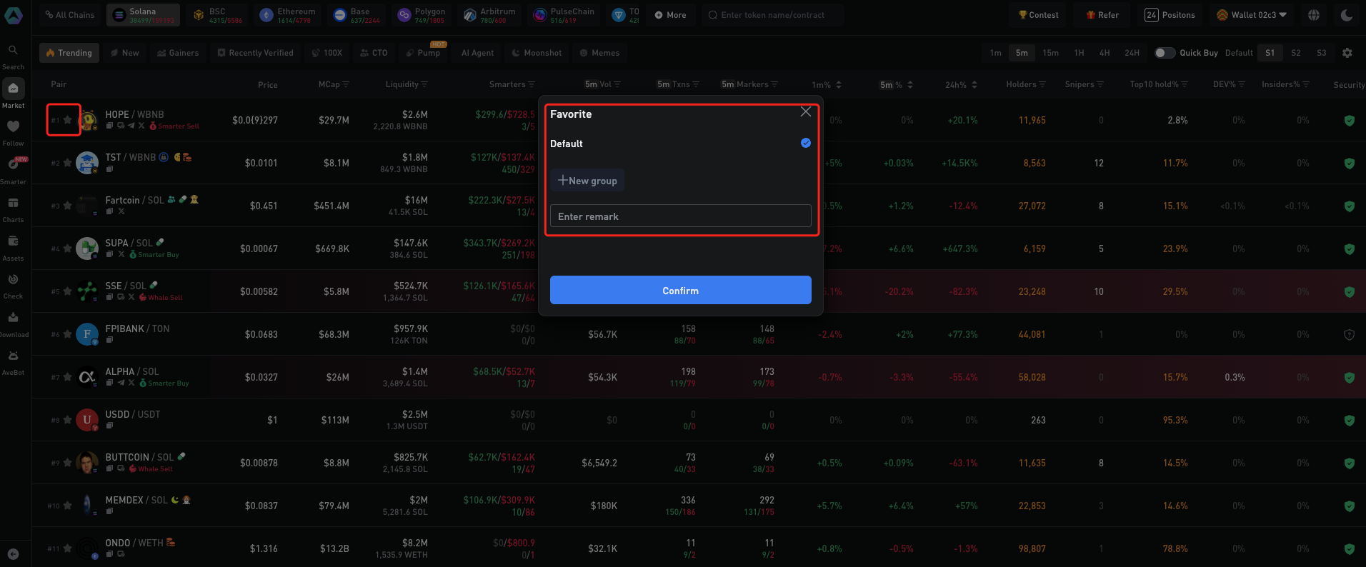 Nhấp vào **biểu tượng ngôi sao** bên trái của token để **thêm vào danh sách Theo Dõi (Follow) trong thanh bên**. Bạn có thể chọn nhóm mặc định hoặc tạo nhóm tùy chỉnh để phù hợp với chiến lược giao dịch của mình.