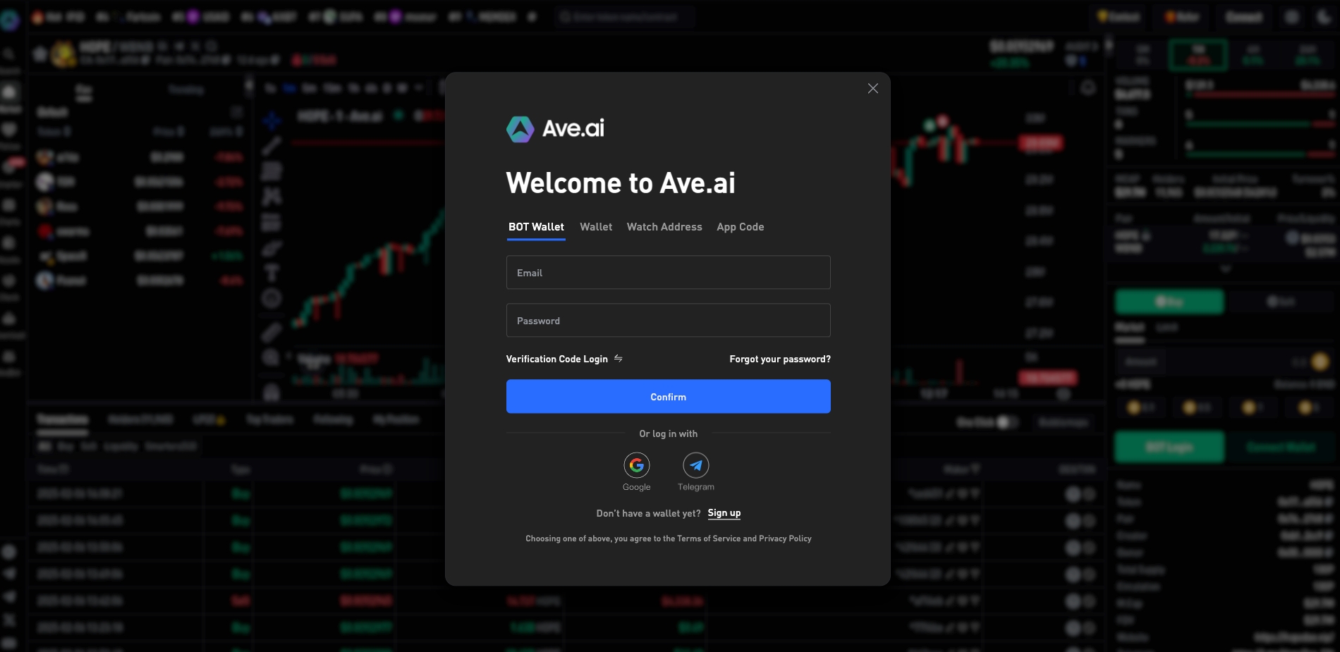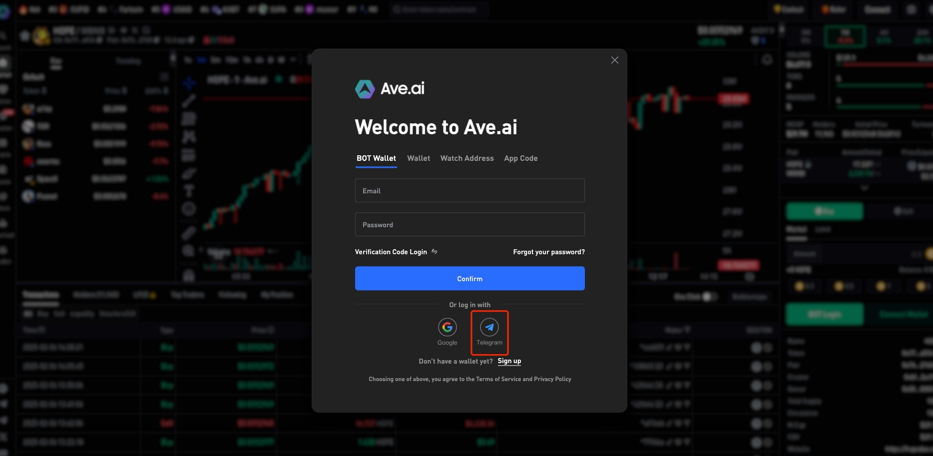 Tạo tài khoản Ave.ai mới bằng email và mật khẩu. Hệ thống sẽ tự động thiết lập một ví Telegram Bot mới và liên kết nó với tài khoản của bạn. Ngoài ra, nền tảng cũng hỗ trợ đăng nhập nhanh bằng Google Email của bạn.