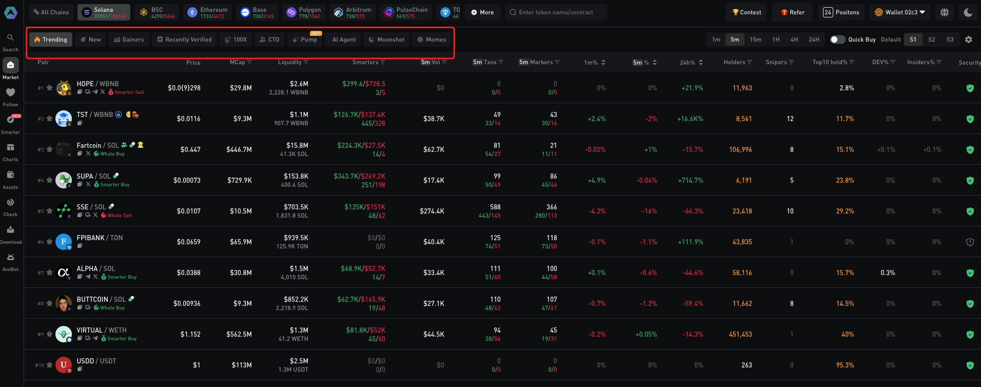 Ave.ai cung cấp nhiều bộ lọc giúp bạn sàng lọc và sắp xếp các cột dữ liệu. Ngoài ra, bạn có thể chọn các khoảng thời gian khác nhau (1 phút, 5 phút, 15 phút, 1 giờ, 4 giờ, 24 giờ) để xem các token trending trong từng giai đoạn này.