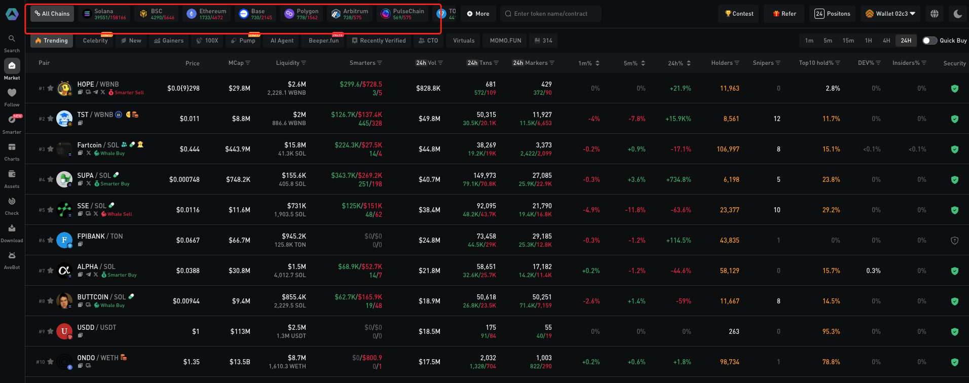 Ave.ai tích hợp hơn 130 blockchain công khai, bao gồm một số hệ sinh thái sôi động nhất cho MEME token như Solana, BSC, Base và Ethereum.