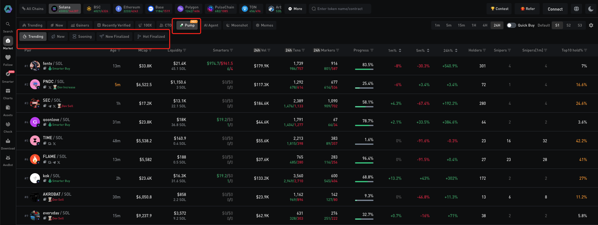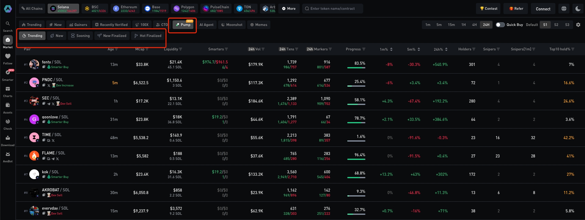 Với danh sách chuyên mục Pump của Ave.ai, bạn có thể theo dõi trạng thái token theo thời gian thực: