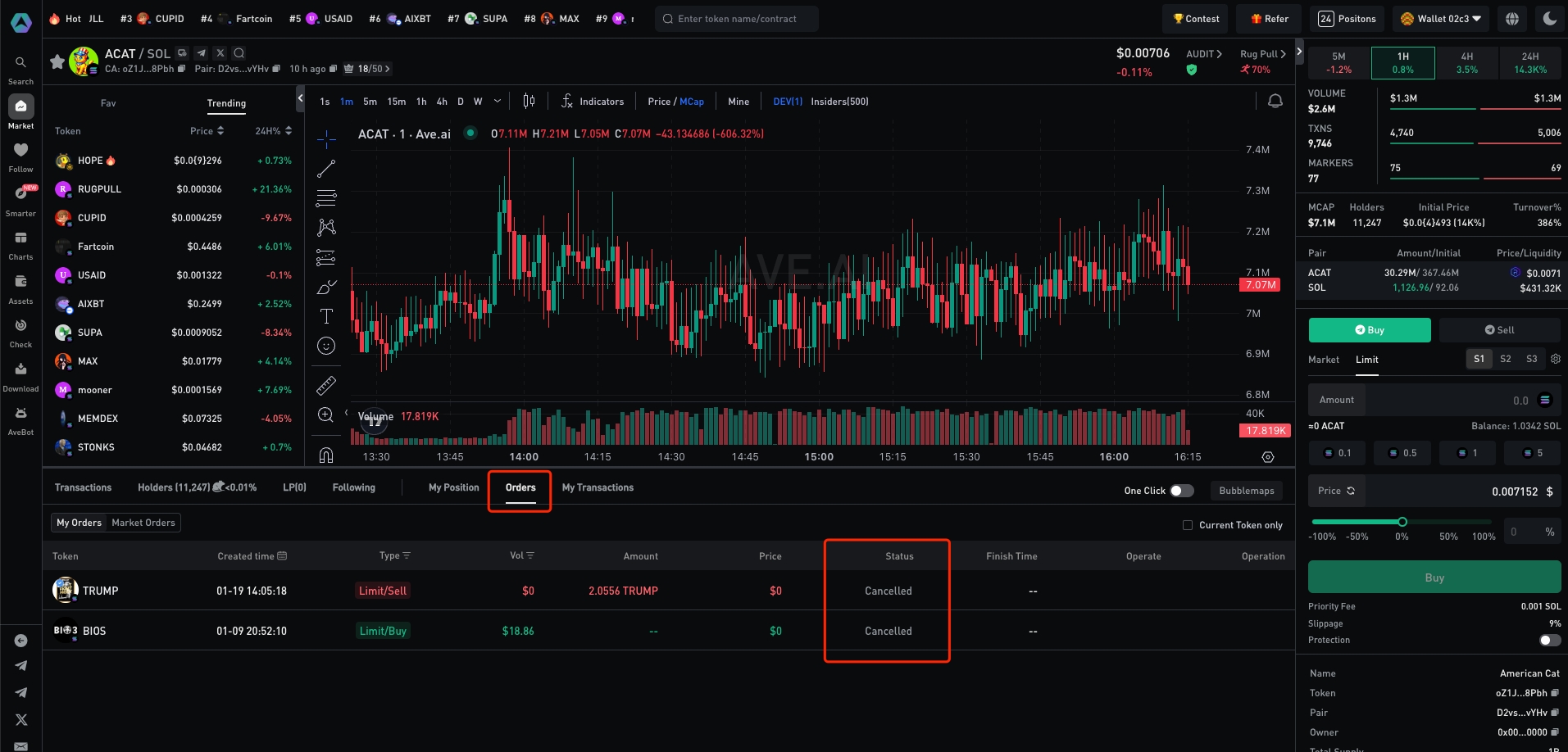 Trên trang chi tiết của bất kỳ token nào, nhấp vào phần "Orders" ở phía dưới để xem, hủy hoặc chỉnh sửa các lệnh đang chờ xử lý.